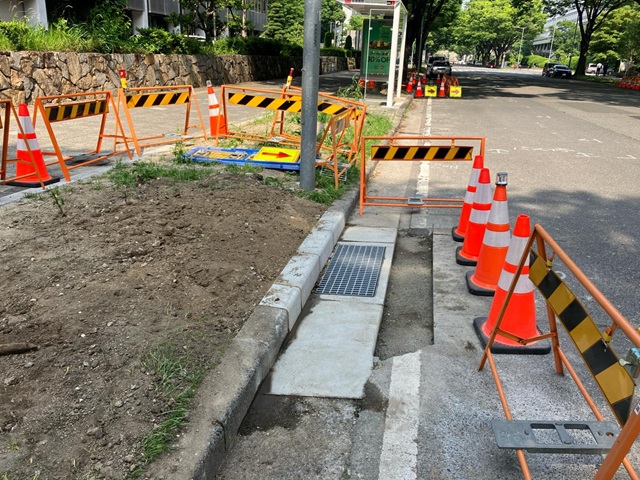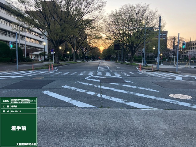 施工場所は県庁の近くに位置しており、昼間は歩行者の通行が多く、路上駐車されている車両も多く見られる地域でしたが、十分な安全対策を講じることで、支障なく施工を行うことができました。