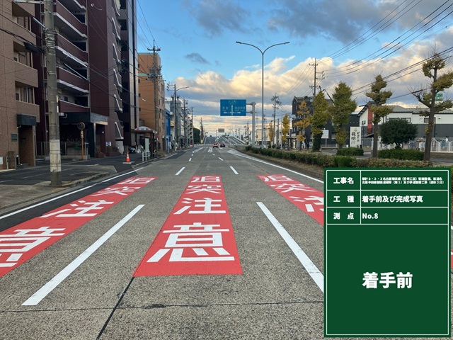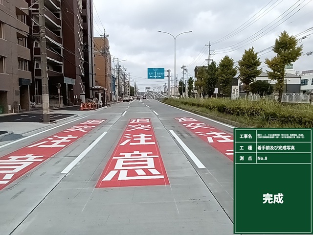 車道舗装工 667m2、歩道舗装工 962m2、街渠工 94m、路幅境界工 63m、区画線工 1式