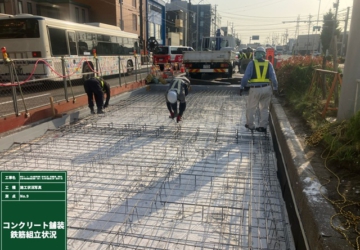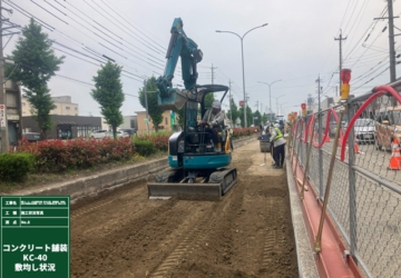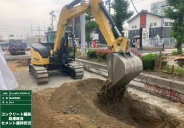 本工事は、電線地中化に伴う復旧工事および歩道勾配の改善を目的として実施しました。 車道部のコンクリート舗装には早期交通開放型コンクリート舗装 「1DAYPAVE」を採用し、養生期間の短縮により早期の交通開放を実現しました。 沿線住民や周辺工事関係者に対しては、積極的な広報活動および事前打合せを行い、円滑に工事を完了することができました。