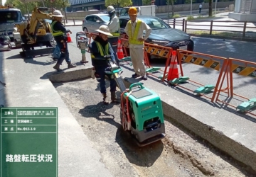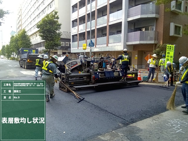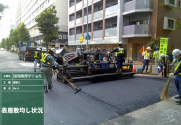 本工事は、名古屋市道外堀町線(西行き車線)の遮水型排水性舗装(POSMAC工法)がメイン工種の修繕工事でした。交通量の多い幹線道路では、夜間の施工でしたが、下請負業者及び自社オペレーターの協力の下、仕上りも良く、平坦性の良好な舗装を施工できました。