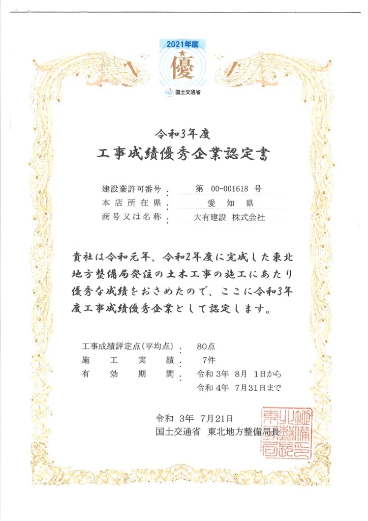 NEWSお知らせ 大有建設 トップ >お知らせ >「工事成績優秀企業」に認定されました 「工事成績優秀企業」に認定されました 2021/08/17 お知らせ 当社は、国土交通省東北地方整備局、関東地方整備局、中部地方整備局、近畿地方整備局、中国地方整備局より、「令和3年度工事成績優秀企業」として認定されました。工事成績優秀企業は、過去2ヶ年に完成した各地方整備局管内の工事における工事成績評定の平均点が80点以上などとなる企業について認定されます。 前の記事 一覧へ戻る 次の記事